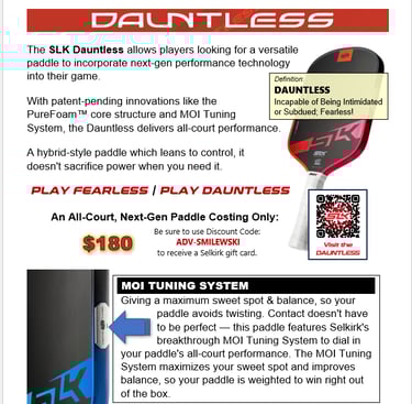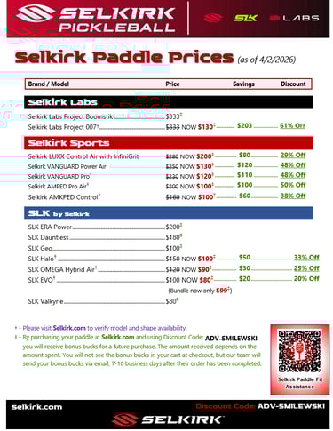 Amy Simpson Moore made sure that I remembered that discounted paddles are Great Deals for players. Most especially newer players who would normally not want to spend the kind of money better Selkirk/SLK/Selkirk Labs paddles normally cost.